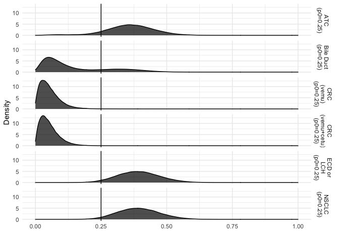 organ-site exceeds the null rate of p0 = 0.25.