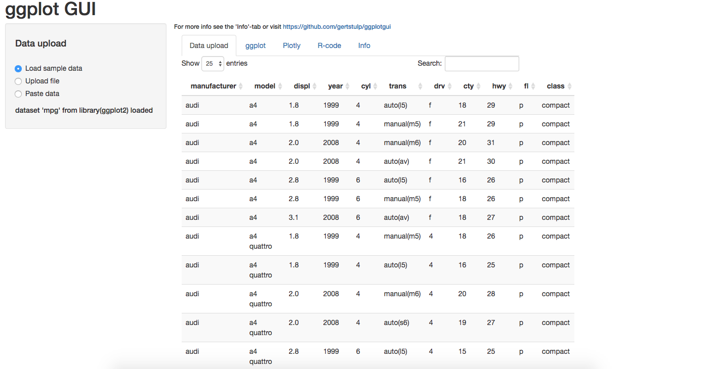 This will open up the following screen: There are four ways in which you can use data within this GUI: 1. You can pass your dataframe through R, by using ggplot_gui(my_df) 2. You can examine sample data (data ‘mpg’ from the ggplot2 package) 3. You can upload your datafile in many different formats (e.g., csv, SPSS, Excel) 4. You can paste some data into a window (the data need to be “tidy”)