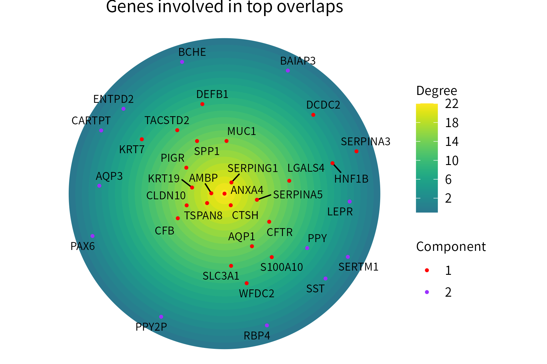 In the example below, it represents the significance of pairs of overlaps between the markers of groups belonging to two identity classes (cell type and donor).