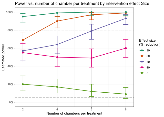 title = "Power vs. number of chamber per treatment by intervention effect Size"