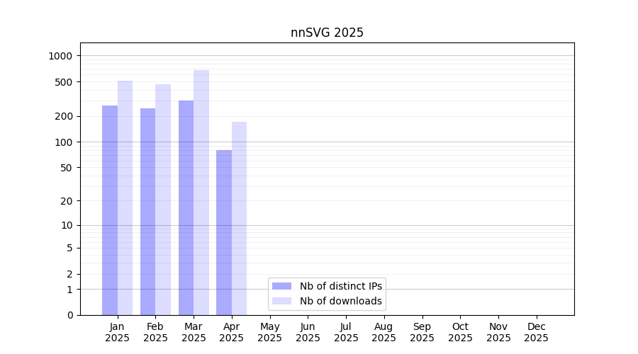 Number of downloads for software package nnSVG, year by year, from 2025 back to 2014 (years with no downloads are omitted):