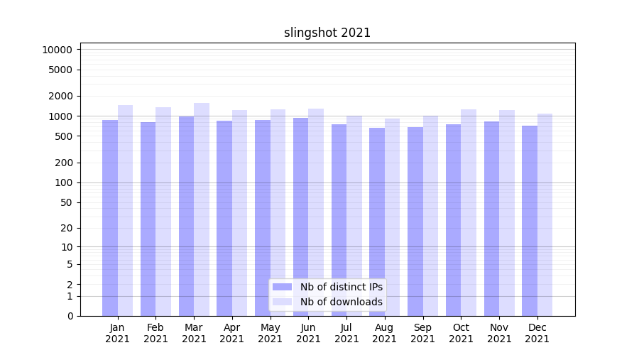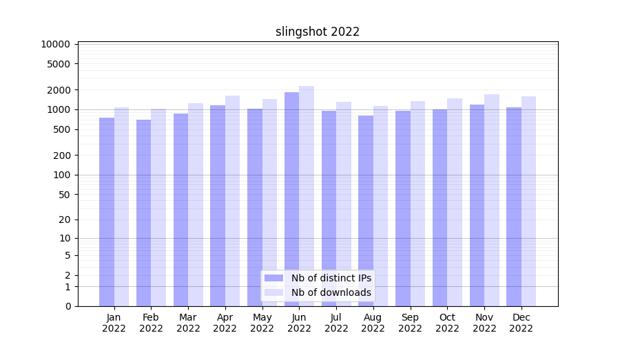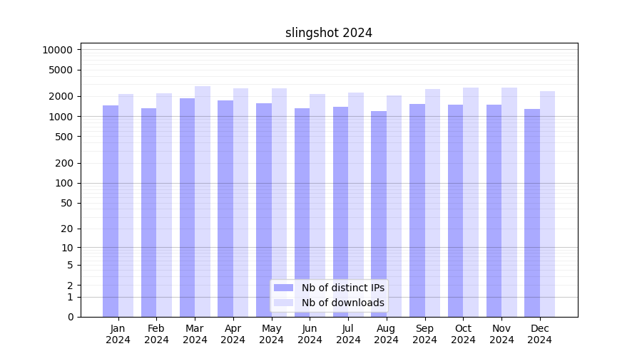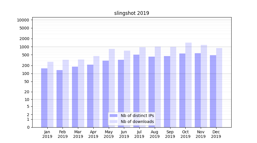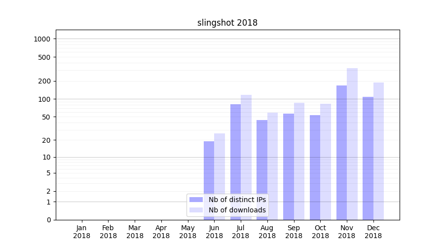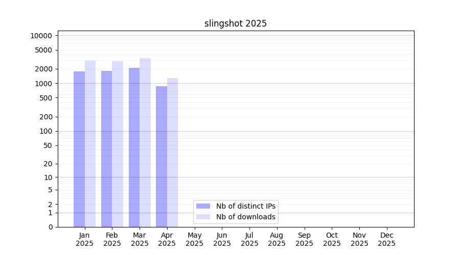 Number of downloads for software package slingshot, year by year, from 2025 back to 2014 (years with no downloads are omitted):